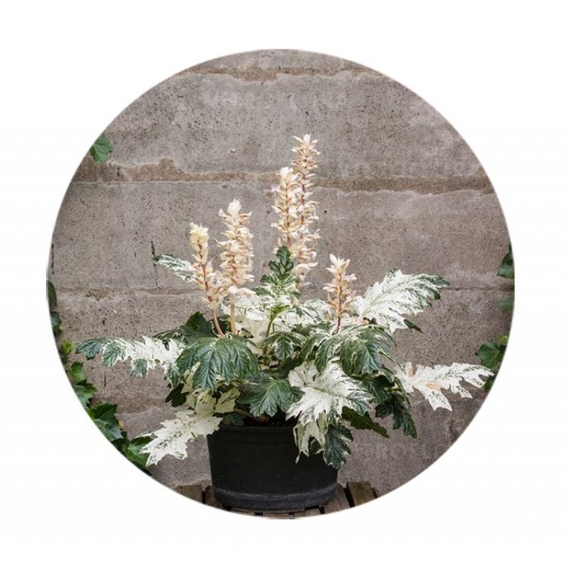 Luminos și viguros, Acanthus "Whitewater" este o plantă perenă care formează aglomerări, oferind un frunziș pestriț superb de frunze mari, profund tăiate, de culoare verde închis, împodobite cu margini și stropi alb-crem. În timpul verii, movila frunzișului este acoperită de tulpini de flori erecte care poartă flori roz și cremă, în formă de pâlnie, cu brățări purpurii asemănătoare glugii. Acanthus este ușor de crescut și îngrijit, necesită foarte puțină îngrijire, durează mult în buchetele înflorite și se pot face aranjamente uscate foarte frumoase. Este o perenă îndrăzneață și arhitecturală în peisagitică care poate fi cultivată ca specimen și poate fi splendidă în grupuri mici.